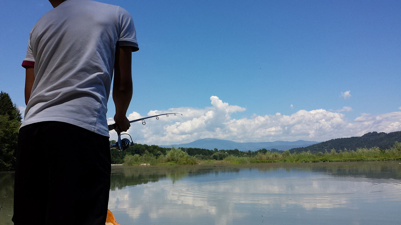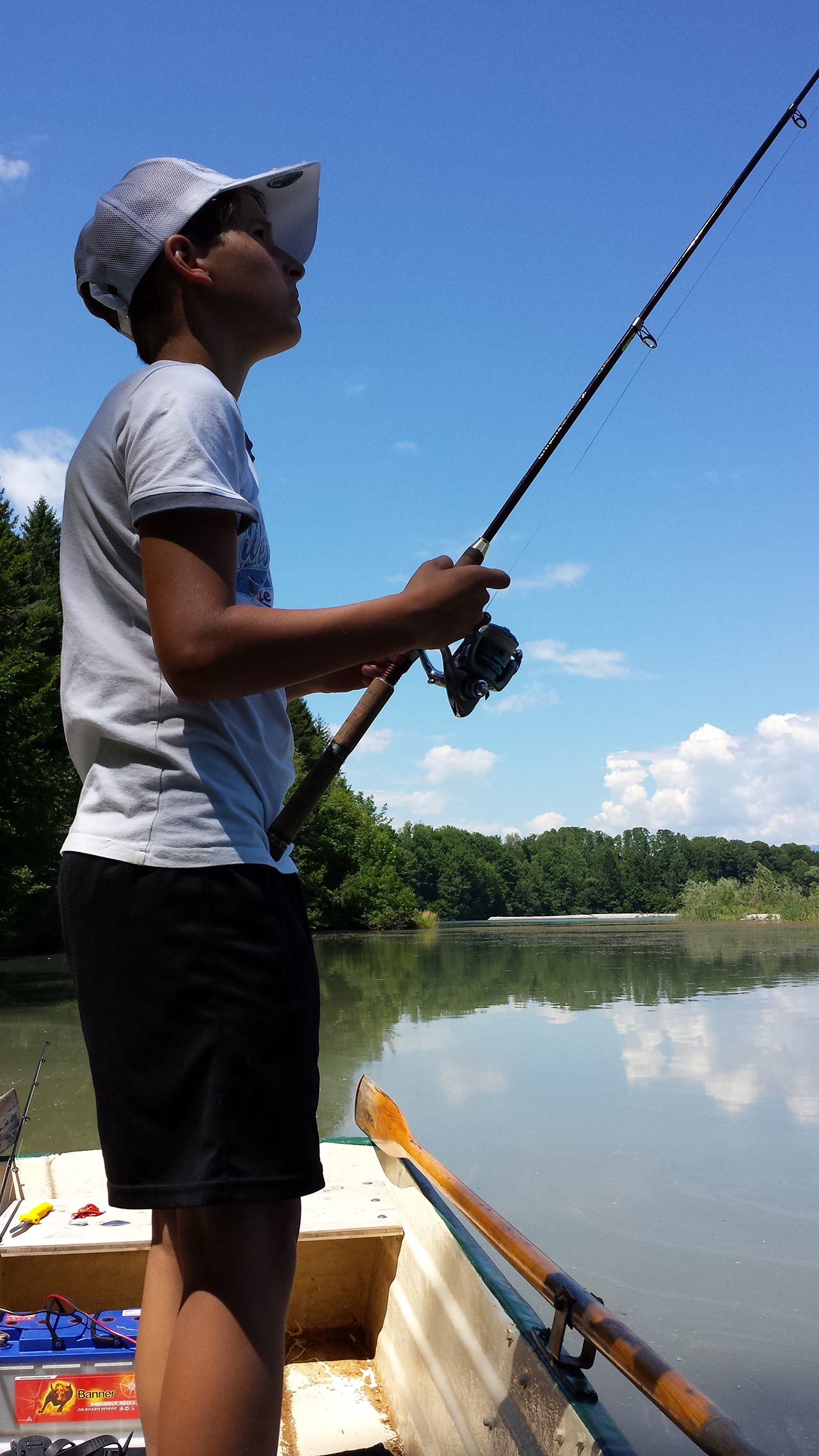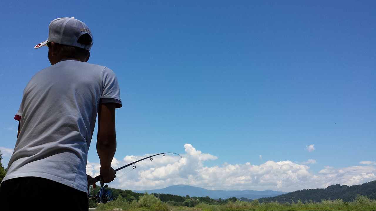 So schnell kann es gehen, wenn man sich in den Fisch hineinversetzen kann.Zielfanggebiet erreicht.Und auf die Plätze…fertig…Feuer…LOS!Und da ist er schon, ein Prachtexemplar!Schnell den lästigen Drilling raus.Einmal kurz gemeinsam in die Kamera grinsen und wieder ab in die Freiheit.Zeit für einen Materialwechsel.Aussicht auf Strein 9.Kurzer Übungsschwung……mit meiner bis dato total….…jungfräulichen Rute.Countdown läuft:3…2…1…YEZZZ!Der tote Karpfen……wurde nur zum Angeben missbraucht.