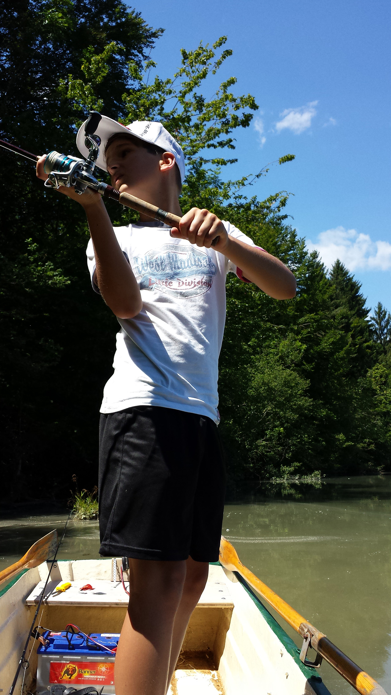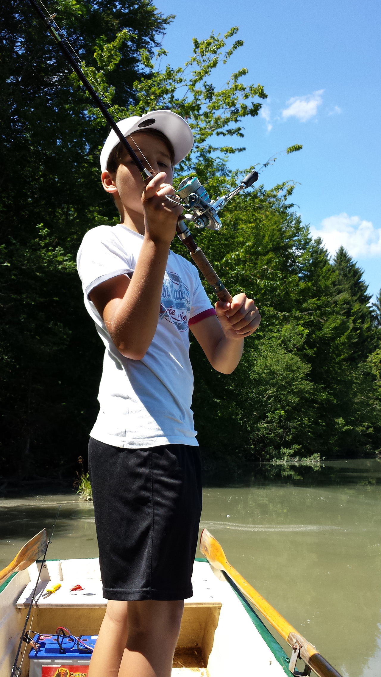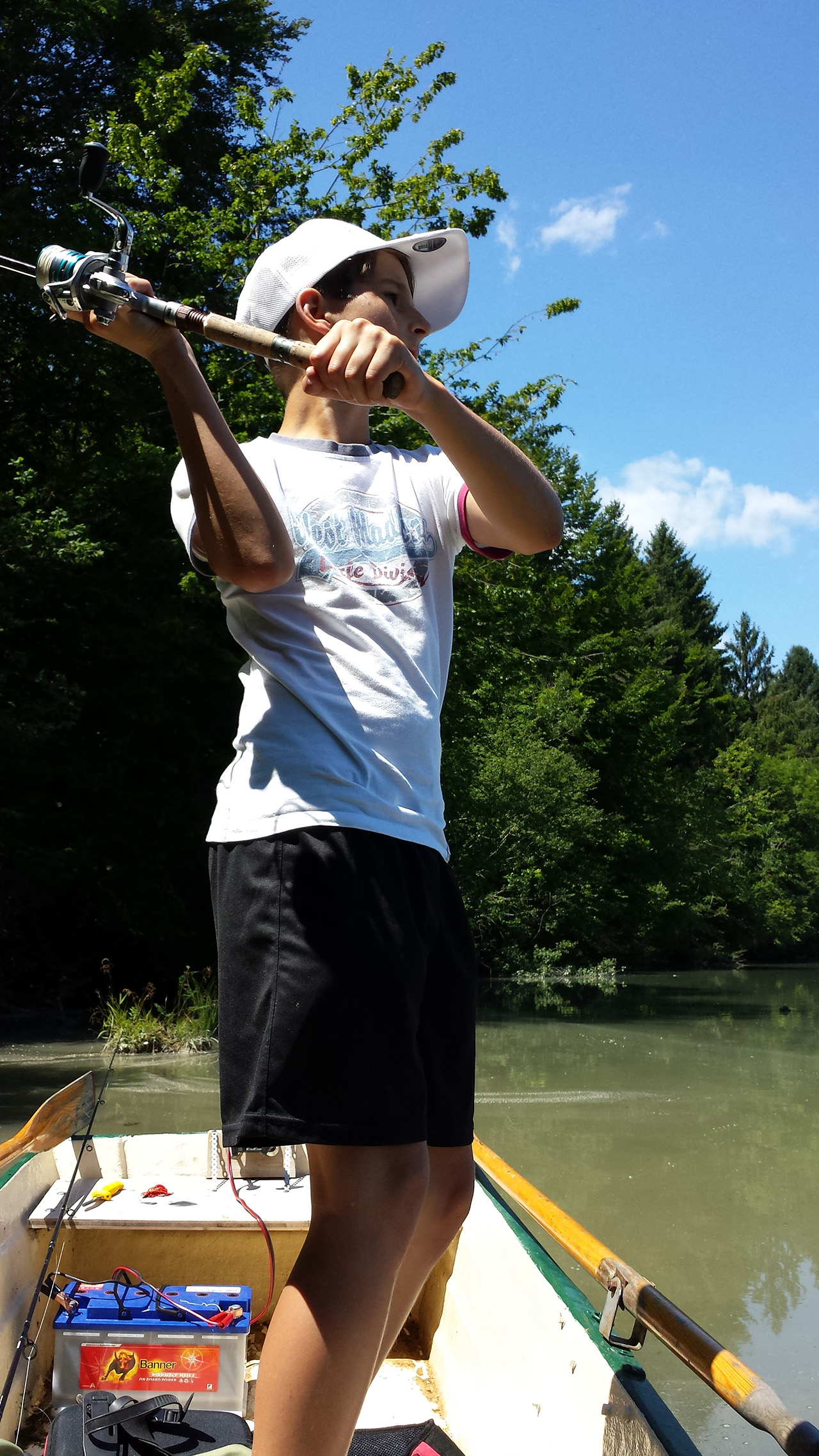 So schnell kann es gehen, wenn man sich in den Fisch hineinversetzen kann.Zielfanggebiet erreicht.Und auf die Plätze…fertig…Feuer…LOS!Und da ist er schon, ein Prachtexemplar!Schnell den lästigen Drilling raus.Einmal kurz gemeinsam in die Kamera grinsen und wieder ab in die Freiheit.Zeit für einen Materialwechsel.Aussicht auf Strein 9.Kurzer Übungsschwung……mit meiner bis dato total….…jungfräulichen Rute.Countdown läuft:3…2…1…YEZZZ!Der tote Karpfen……wurde nur zum Angeben missbraucht.